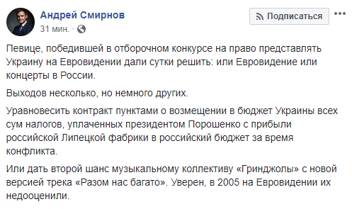 "Выходов несколько, но немного других. Уравновесить контракт пунктами о возмещении в бюджет Украины всех сум налогов, уплаченных президентом Порошенко с прибыли российской Липецкой фабрики в российский бюджет за время конфликта. Или дать второй шанс музыкальному коллективу «Гринджолы» с новой версией трека «Разом нас багато». Уверен, в 2005 на Евровидении их недооценили", пишет адвокат Андрей Смирнов.