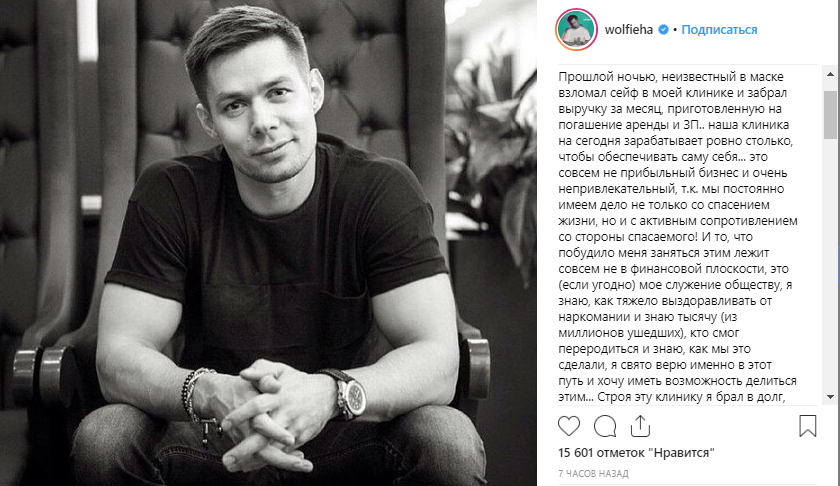По словам Пьехи, в здание проник неизвестный в маске и взломал сейф. "Прошлой ночью, неизвестный в маске взломал сейф в моей клинике и забрал выручку за месяц, приготовленную на погашение аренды и зарплаты. Наша клиника на сегодня зарабатывает ровно столько, чтобы обеспечивать саму себя... это совсем не прибыльный бизнес и очень непривлекательный, т.к. мы постоянно имеем дело не только со спасением жизни, но и с активным сопротивлением со стороны спасаемого! И то, что побудило меня заняться этим, лежит совсем не в финансовой плоскости, это (если угодно) мое служение обществу, я знаю, как тяжело выздоравливать от наркомании и знаю тысячу (из миллионов ушедших), кто смог переродиться и знаю, как мы это сделали, я свято верю именно в этот путь и хочу иметь возможность делиться этим... Строя эту клинику я брал в долг, продал квартиру... я знаю, что должен этим заниматься и все тут, ничто другое меня совсем не прельщает. Из сейфа украли 1200000 рублей. Больше там никаких денег храниться не будет", - написал известный певец.