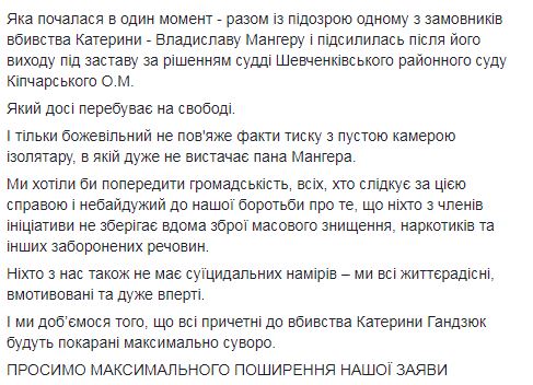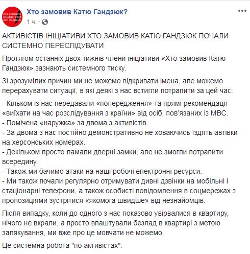 Активисты утверждают, что осмелились заявить о давлении публично после того, как в квартиру к одному из них "показательно ворвались, ничего не украли, а просто устроили беспорядок с целью запугивания". Они сообщают, что начались преследования "в один момент", когда объявили о подозрении одному из заказчиков убийства Гандзюк председателю Херсонского облсовета Владиславу Мангеру. Отмечается, что давление усилилось после выхода Мангера под залог. "Мы хотели бы предупредить общественность о том, что никто из членов инициативы не хранит дома оружия массового уничтожения, наркотиков и других запрещенных веществ. Никто из нас также не имеет суицидальных намерений", - говорится в заявлении активистов.