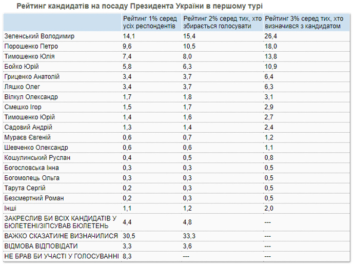Среди украинцев, которые определились, за кого будут голосовать на выборах президента, 26,4% готовы поддержать шоумена, кандидата в президенты Владимира Зеленского. За действующего президента Петра Порошенко готовы отдать голоса 18%, за Юлию Тимошенко – 13,8%, за Юрия Бойко – 10,9%. Анатолия Гриценко готовы поддержать 6,4%, Олега Ляшко – 6,3%. Вместе с тем среди тех, кто собирается идти на выборы, с кандидатом не определились 33,3%, еще 4,8% собираются испортить бюллетень, а 3,6% отказались ответить.