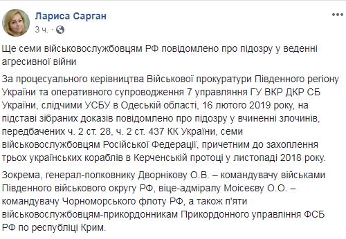 "Под процессуальным руководством Военной прокуратуры Южного региона Украины и оперативного сопровождения 7 Управления ГУ ВКР ОКР СБ Украины, следователями УСБУ в Одесской области, 16 февраля 2019 года, на основании собранных доказательств сообщено о подозрении в совершении преступлений, предусмотренных ч. 2 ст. 28 ч. 2 ст. 437 УК Украины, семи военнослужащим Российской Федерации, причастным к захвату трех украинских кораблей в Керченском проливе в ноябре 2018 года", - отметила она.