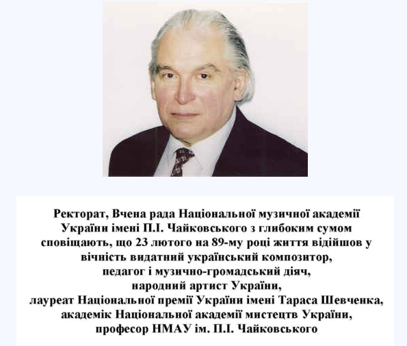 "Ректорат, ученый совет, коллектив Национальной музыкальной академии им. Чайковского выражают соболезнования родным, близким, коллегам и ученикам покойного", - говорится в сообщении. Отмечается, что о дате, времени и месте прощания с артистом будет сообщено позже.