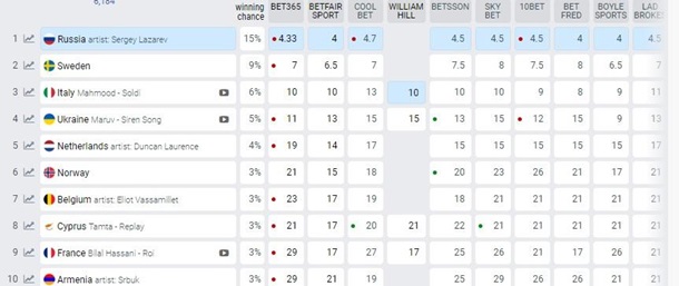 Лидерство среди потенциальных победителей удерживает представитель России Сергей Лазарев с 15% на победу. Швеция на текущий момент - вторая с 9%. Третья по версии букмекеров - Италия с 6%.