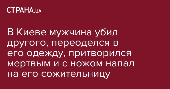 В воскресенье, 25 февраля, в Киеве злоумышленник убил мужчину, оделся в его одежду и притворился мертвым. Когда в квартиру, где произошло преступление, вошла сожительница погибшего, подозреваемый вскочил, напал на нее и скрылся. Об этом пишет "Киев оперативный"