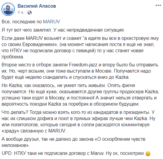 Именно он еще до финала Нацотбора заявил, что против участия в нем тех, кто ездил на гастроли "в страну-агрессор". А после того, как победила Maruv, он многозначительно намекнул, что ее победа не предопределена.