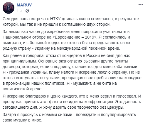 MARUV сообщила, что готова была пойти на компромисс по вопросу выступлений в России, но перед ней поставили и ряд других условий. После этого певица сообщила, что "не готова выступать с лозунгами", а также превращать выступление на Евровидении в "промо-акции наших политиков".