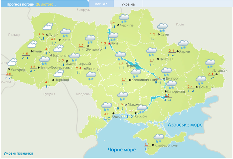 По прогнозу Укргидрометцентра погода в Украине во вторник, 26 февраля, будет облачной. В ряде регионов страны ожидаются снегопады. Ночью столбики термометров покажут от -3 в центральных и западных областях до -3 на юге Украины.