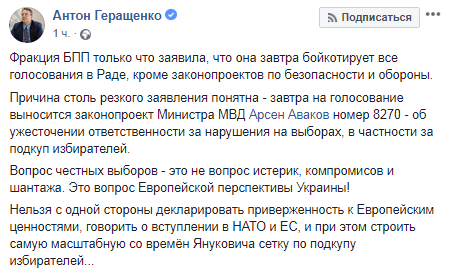 "Фракция БПП только что заявила, что она завтра бойкотирует все голосования в Раде, кроме законопроектов по безопасности и обороны. Причина столь резкого заявления понятна - завтра на голосование выносится законопроект Министра МВД Арсена Авакова номер 8270 - об ужесточении ответственности за нарушения на выборах, в частности за подкуп избирателей", - написал Геращенко.