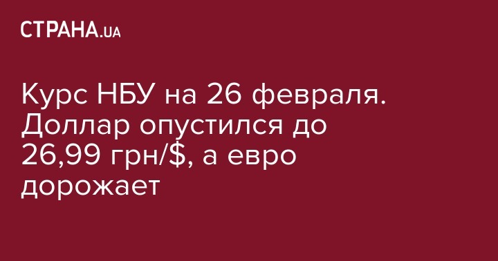 Нацбанк Украины (НБУ) установил официальный курс основных валют по отношению к гривне на вторник, 26 февраля. Сегодня курс доллара составил 26,99 грн/доллар, что на 2 копейки ниже по сравнению с предыдущим банковским днем. Об этом свидетельствует информация на сайте регулятора.