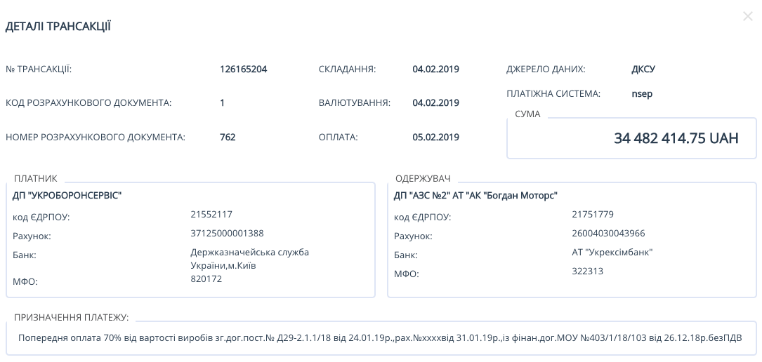 В начале февраля государственное предприятие "Укроборонсервис", которое входит в структуру концерна "Укроборонпром", заплатило Автосборочному заводу №2 компании "Богдан Моторс" 34,4 миллиона гривен за "изделия" на выполнение договора с Минобороны. Об этом сообщает Глеб Каневский, глава экспертной организации StateWatch, со ссылкой на официальный портал использования публичных финансов, передает "Экономическая правда".