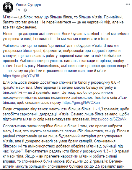 Супрун рассказала, сколько нужно есть белка, чтобы нарастить мышцы или остаться худым