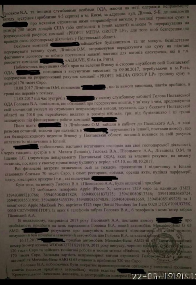 Кроме того, губернатор получил у представителя взятку в виде оплаты отдыха чиновников ОГА в Испании. В октябре сам Головко, его заместитель Песоцкий, советник Литвинов и директор департамента ОГА Ищенко И.С. осуществили это путешествие. Стоимость путешествия составила 70 000 евро. Как выяснили сыщики, также по требованию Головко были приобретены 12 мобильных телефонов iPhone 10 и компьютер MacBook Pro. 6 , которые забрал председатель ОГА, 6 телефонов и ноутбук достались Песоцкому.