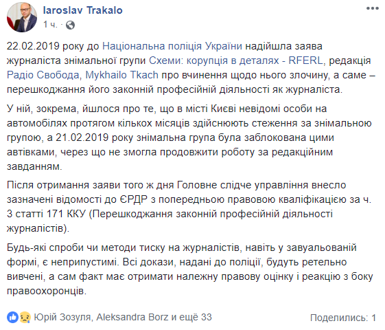 "22 февраля 2019 года в Нацполицию Украины поступило заявление журналиста съемочной группы "Схемы: коррупция в деталях - RFERL, редакция Радио Свобода, Михаила Ткача о совершении против него преступления, а именно - препятствования его законной профессиональной деятельности как журналиста. В нем, в частности, шла речь о том, что в Киеве неизвестные лица на автомобилях в течение нескольких месяцев осуществляют слежку за съемочной группой, а 21 февраля 2019 году съемочная группа была заблокирована этими автомобилями, из-за чего не смогла продолжить работу по редакционному заданию", - написал Ярослав Тракало.