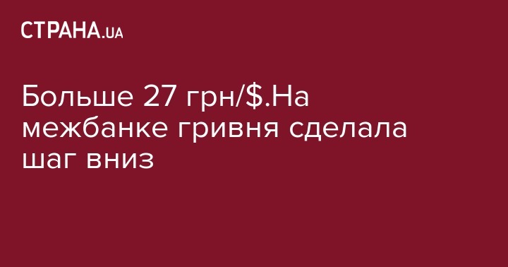 Как сообщала "Страна", в понедельник, 25 февраля, гривня на межбанковском валютном рынке опустилась ниже психологической отметки в 27 грн/$1. Котировки гривни к окончанию торгов составили 26,9 - 26,93 грн/$1.