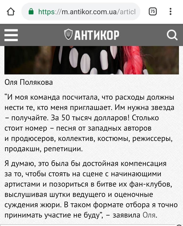 "Ни для кого не секрет - это все звучало открыто. Но после отбора это не интересно даже за еще большие деньги... Подобного дна надо успеть достичь.. Это было не просто невдобно. Это была жопа... И ты это знаешь. А про гарантии интересно очень", - написал Ясинский, прикрепив скрин в котором Ольга Полякова заявляла, что не будет принимать участие в таком формате Нацотбора, а расходы звезды оценила в 50 тысяч долларов.