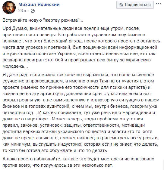 "Я даже рад, если можно так конечно выразиться, что наше косвенное соучастие в произошедшем, ... и замена [Tayanna] на [Maruv] и дальнейший срач с участием всех и вся вскрыл реальную, а не вымышленную и иллюзорную ситуацию в нашем бизнесе и в головах аудиторий, о чем мы, внутри бизнеса, говорим уже четвертый год... И как вы понимаете, тут уже речь не о Евровидении и даже не о нацотборе.. Может теперь, когда проблема отсутствия правил, законов, установок, защиты, ответственности, мотиваций достигла верхних этажей украинского общества и власти кто-то, хотя даже не представляю кто, сможет наконец-то рассмотреть все угрозы и, как минимум, выслушать индустрию, которая если не знает, что делать, то хотя бы готова это обсуждать и что-то делать. А пока просто наблюдайте, как все это будет мастерски использовано против всего, что получилось за эти несколько лет", - отметил Ясинский.