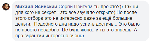 В комментарии к посту Ясинского ведущий Нацотбора Сергей Притула намекнул, что продюсеры Нацотбора получали предложения от артистов проекта, в которых некоторые требовали гарантий для исполнителя, другие же называли цену участия в конкурсе.