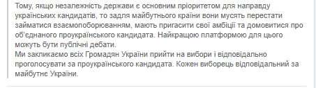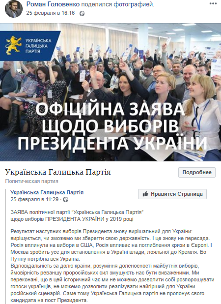 В заявлении также содержится похвала "достижений действующей власти": поместной церкви, декоммунизации, евроинтеграции, украинизации, хотя и указывается, что некоторые моменты не дают возможности поддерживать Петра Порошенко "безапелляционно". Отметим, что Роман Головенко является не просто членом партии, а и одним из руководителей и членом Совета Киевской городской организации Украинской галицкой партии.