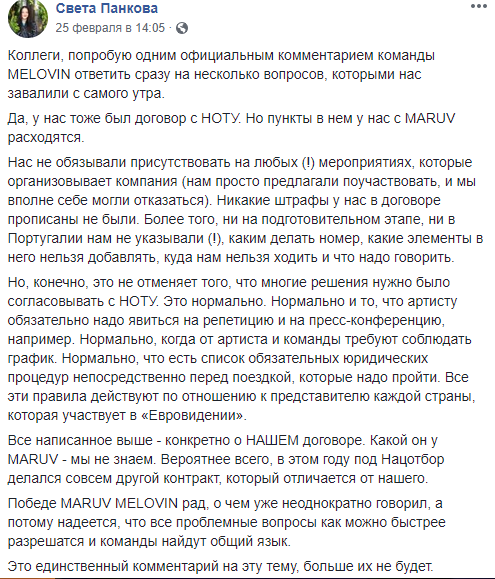 Пиар-менеджмент участника музыкального конкурса Евровидение-2018 от Украины Melovin Светлана Панкова рассказала, что НОТУ год назад предлагала подписать другой контракт по Евровидению, чем тот, который отказалась подписывать певица Maruv. Об этом Панкова написала на своей странице в Facebook.