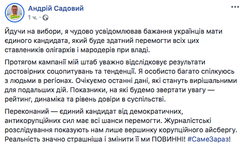 "Идя на выборы, я прекрасно осознавал желание украинцев иметь единого кандидата, который будет способен победить всех этих ставленников олигархов и мародеров у власти.
