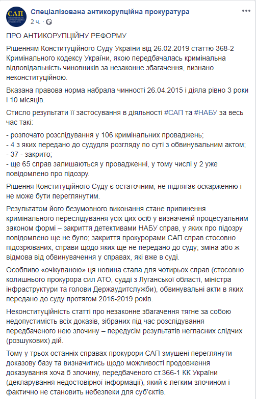 Прокуратура напомнила, что признанная неконституционной статья 368-2 Уголовного кодекса действовала ровно 3 года и 10 месяцев и за это время САП и НАБУ начали по ней расследования по 106 уголовным производствам, 4 из которых переданы в суд для рассмотрения по существу с обвинительным актом, еще 65 дел остаются в производстве, в том числе по 2 уже сообщено о подозрении.