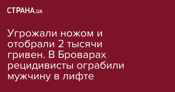 По информации правоохранителей, неоднократно судимые жители города Бровары в лифте одного из жилых домов города, угрожая потерпевшему ножом, отобрали у него более 2 тысяч грн.