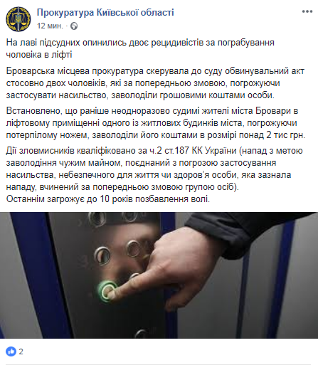 Двоим злоумышленникам, которые в Броварах под Киевом обокрали в лифте мужчину, угрожая ему ножом, грозит до 10 лет тюрьмы. Об этом сообщает пресс-служба прокуратуры Киевской области на странице в Facebook.