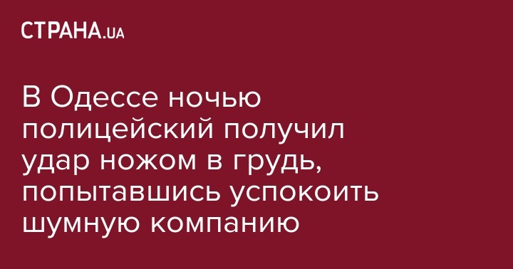 В Одессе 33-летний полицейский получил удар ножом в грудь после того, как попытался призвать к порядку шумную комномпанию. Инцидент произошел ночью в Одессе, сообщается на сайте регионального ГУНП.
