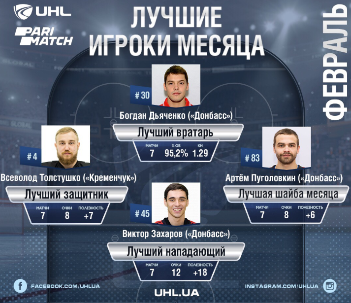 Лучшим нападающим февраля стал капитан "Донбасса" Виктор Захаров. Форвард набирал очки во всех 7 матчах, заработав 12 (4+8) результативных баллов при показателе полезности +18.