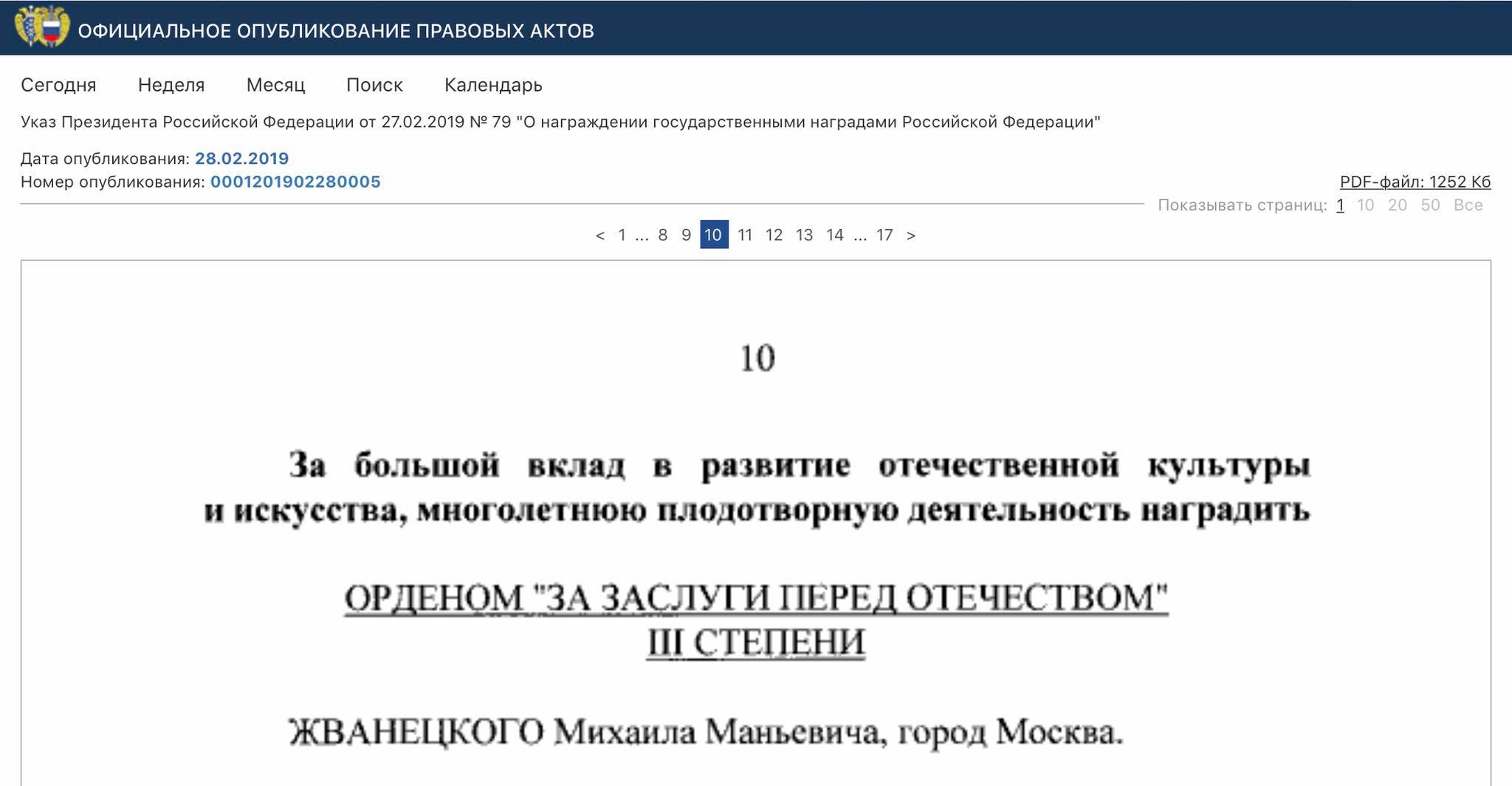 28 февраля президент РФ Владимир Путин наградил народного артиста Украины и народного артиста РФ, сатирика Михаила Жванецкого орденом "За заслуги перед Отечеством" III степени.