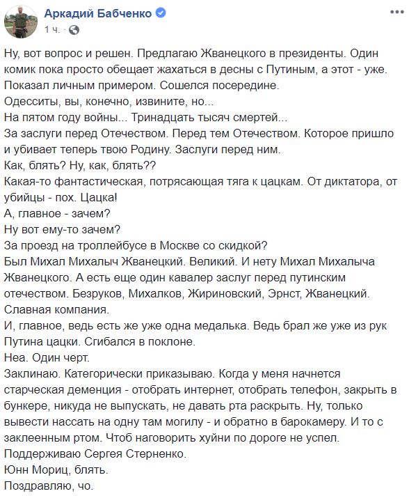 Экспрессивным постом разразился и журналист Аркадий Бабченко: