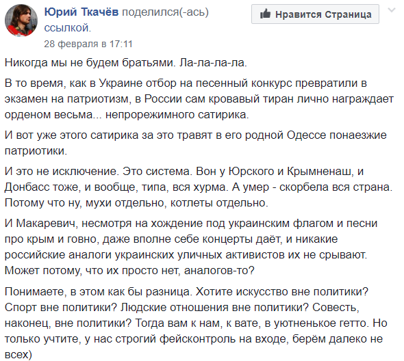 И Макаревич, несмотря на хождение под украинским флагом и песни про крым и говно, даже вполне себе концерты дает, и никакие российские аналоги украинских уличных активистов их не срывают. Может, потому, что их просто нет, аналогов-то?".