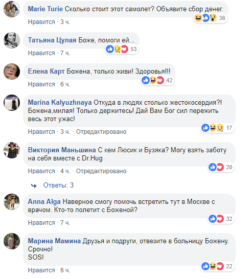 "Божена не встает совсем. В аэропорт ее не отвезти. Помогите, кто может дать санитарный самолет...", - пишут друзья журналистки с ее же аккаунта в соцсети. Знакомые и коллеги журналистки в полном замешательстве: они планируют объявить сбор средств. Также коллеги переживают о судьбе домашних животных Божены, которых также необходимо перевезти из Испании в Россию.