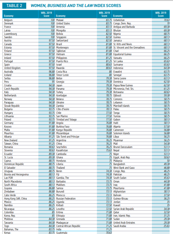 Между тем, единственными странами в мире, которые закрепили гендерное равенство в законах, влияющих на работу, стали Бельгия, Дания, Франция, Латвия, Люксембург и Швеция.