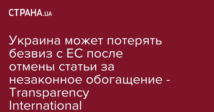 В международной организации Transparency International заявили, что граждане Украины рискуют потерять безвизовый режим с ЕС после отмены ответственности за незаконное обогащение. Об этом сообщает официальный сайт организации.