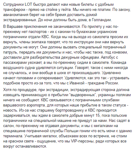 "Хотя по процедуре, при экстрадиции, экстрадирующая сторона должна извещать принимающую о прибытии "выдворенных", украинцы полякам ничего не сообщают. КВС связывается с пограничными службами варшавского аэропорта, для которых наше прибытие в таком статусе - новость. Из-за нас старшему бортпроводнику и КВС приходится задерживаться, мы ждем в самолете добрые минут 15, пока польские пограничники на специальной машине не приедут за нами. Нас садят в салон, по-прежнему не отдавая документы, и мы с мигалками на спецмашине пограничной службы Польши гоним что есть мочи к зданию терминала", - пишет киевлянин.