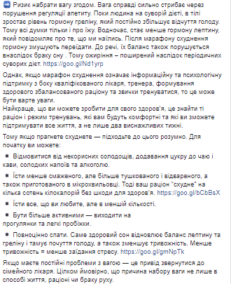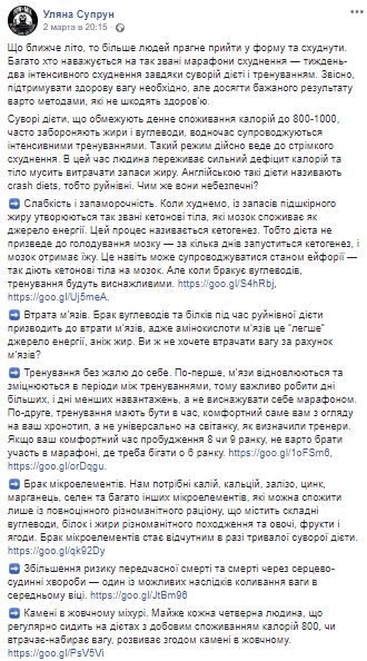 И.о. министра здравоохранения Украины Ульяна Супрун отмечает разрушительное действие подобного марафона похудения, который действительно, ведет к стремительному сбросу веса, но при этом у человека наблюдается дефицит калорий. На английском такие диеты называют crash diets, то есть разрушительные.