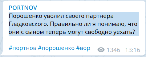 "Порошенко уволил своего партнера Гладковского. Правильно ли я понимаю, что они с сыном теперь могут свободно уехать?"