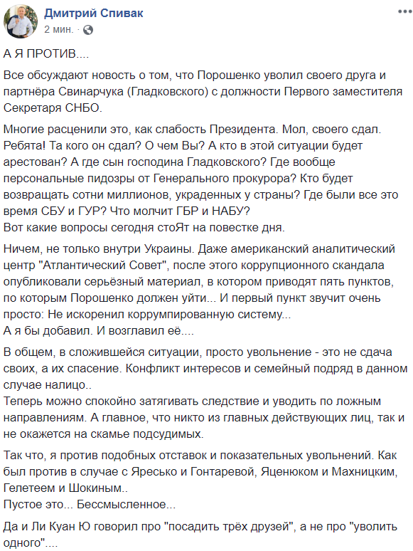"Многие расценили это как слабость президента. Мол, своего сдал. Ребята! Та кого он сдал? О чем вы? А кто в этой ситуации будет арестован? А где сын господина Гладковского? Где вообще персональные пидозры от генерального прокурора? Кто будет возвращать сотни миллионов, украденных у страны? Где были все это время СБУ и ГУР? Что молчат ГБР и НАБУ?