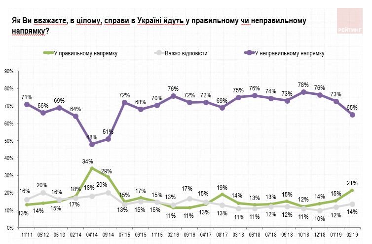 Судя по графику, за последние 8 лет лучшие показатели были в апреле 2014 года, когда 34% украинцев считали, что Украина движется в правильном направлении, а 48% - что в неправильном. В то же время, за последний год количество недовольных уменьшилась с 75% до 65%.