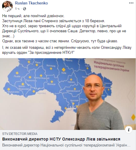 Отметим, в соцсетях сообщают, что 18 марта ожидается увольнение заместителя исполнительного директора НОТУ Александра Лиева - Лилии Стиренко. "Это не первый, но заметный звоночек... Кто не в курсе, сейчас ведутся следственные действия по коррупции в центральной дирекции Общественного, которую возглавлял Саша [Александр Лиев, - Прим.Ред]. Детектор, вероятно, об этом не знает. Однако, все тайное со временем становится явным. Следим, здесь будет интересно. И, как сказал мой товарищ, все с нетерпением ждут когда Александру Лиеву вручат орден "За присоединение НТКУ!", - пишет в Facebook Руслан Ткаченко.