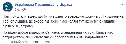 "На видео хорошо видно, как бьет пожилых людей скандальный "клирик Киевского патриархата", в свое время "прославился" на Збаражчине за политический рэкет, Иван Лесик", - указано в опубликованном сообщении.