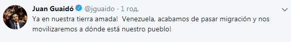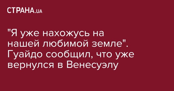 "Я уже нахожусь на нашей любимой земле", - говорится в его твиттер-микроблоге. О том, каким именно образом Гуайдо вернулся на родину, пока не известно.