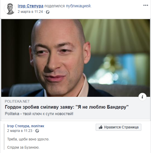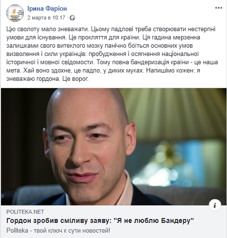 "...Пишет заместитель председателя Кировоградского областного совета Игорь Степура. Мое фото и подпись: "Треба, щоби воно здохло - слідом за Бузиною". В комментариях под этим постом Фарион пишет: "Да. Бузина заждался. Пусть сдохнет", - рассказал Гордон.