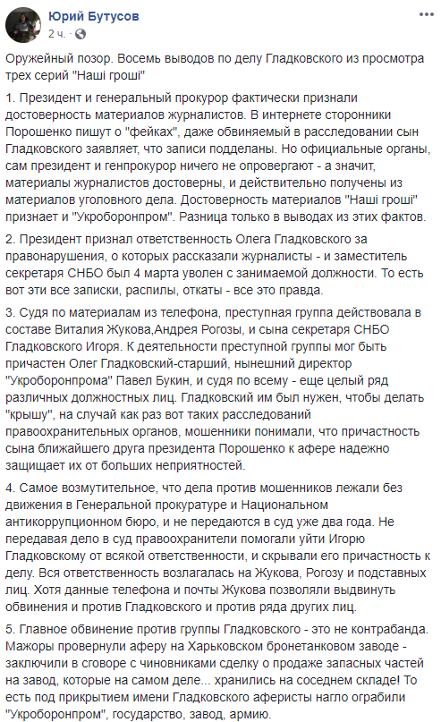 "1. Президент и генеральный прокурор фактически признали достоверность материалов журналистов. В интернете сторонники Порошенко пишут о "фейках", даже обвиняемый в расследовании сын Гладковского заявляет, что записи подделаны. Но официальные органы, сам президент и генпрокурор ничего не опровергают - а значит, материалы журналистов достоверны, и действительно получены из материалов уголовного дела. Достоверность материалов "Наші гроші" признает и "Укроборонпром". Разница только в выводах из этих фактов.