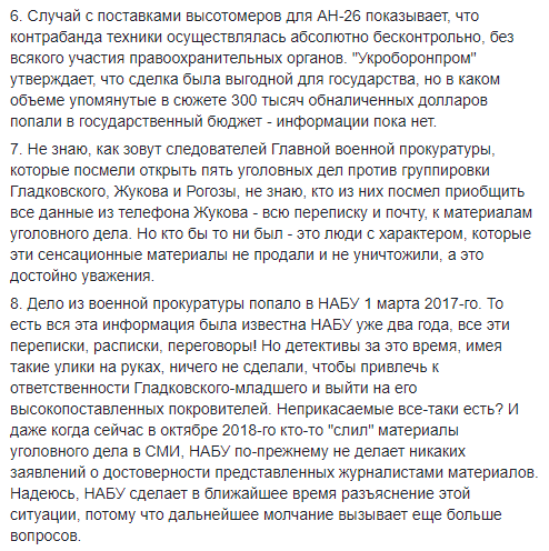 8. Дело из военной прокуратуры попало в НАБУ 1 марта 2017-го. То есть вся эта информация была известна НАБУ уже два года, все эти переписки, расписки, переговоры! Но детективы за это время, имея такие улики на руках, ничего не сделали, чтобы привлечь к ответственности Гладковского-младшего и выйти на его высокопоставленных покровителей. Неприкасаемые все-таки есть? И даже когда сейчас в октябре 2018-го кто-то "слил" материалы уголовного дела в СМИ, НАБУ по-прежнему не делает никаких заявлений о достоверности представленных журналистами материалов. Надеюсь, НАБУ сделает в ближайшее время разъяснение этой ситуации, потому что дальнейшее молчание вызывает еще больше вопросов".