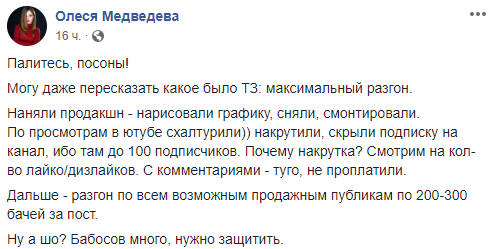 Интересно, что ролик активно разгонялся по YouTube за деньги. Об этом у себя в Facebook пишет известный видеоблогер Олеся Медведева.