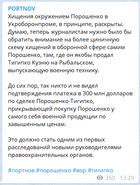 "Хищения окружением Порошенко в Укроборонпроме, в принципе, раскрыты. Думаю, теперь журналистам нужно было бы обратить внимание на более циничную схему хищений в оборонной сфере самим Порошенко, там, где он якобы продал Тигипко Кузню на Рыбальском, выпускающую военную технику.