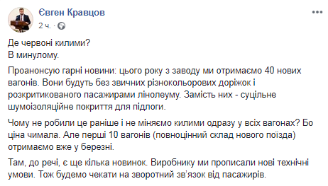 "Проанонсю хорошие новости: это года с завода мы получим 40 новых вагонов. Они будут без привычных разноцветных дорожек и раскритикованного пассажирами линолеума. Вместо них - сплошное шумоизоляционное покрытие для пола", - написал Кравцов.