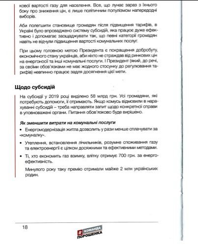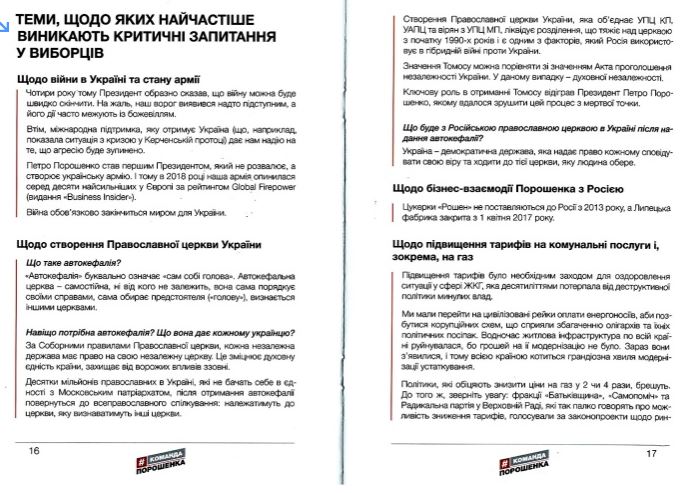 Авторы пособия называют агитаторов словом "единомышленники". В брошюре приводятся примеры тренировочных занятий с ними, а также варианты разговоров с избирателями. Основные темы – война на Донбассе, состояние экономики, пенсионная реформа, получение Украиной безвиза и томоса об автокефалии национальной православной церкви, обещание кандидата закрыть свой бизнес в России и т.д. Например, среди достижений Петра Порошенко, о которых нужно рассказать избирателям сказано, что "в планах Кремля было захватить почти половину Украины, но Порошенко смог дать жесткий отпор". Или, например, на вопрос о повышении тарифов нужно отвечать, что это были "необходимые меры для оздоровления ситуации в ЖКХ, которое десятилетиями страдало от деструктивной политики прошлых властей".